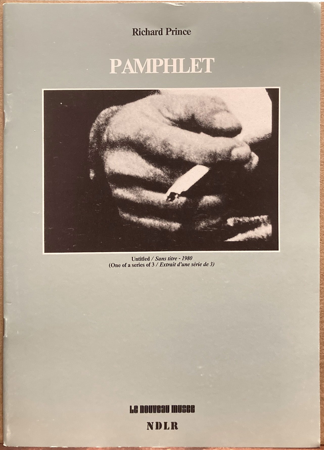 Le Nouveau Musée, 1983. Essay by Kate Linker. Issued on the occasion of Richard Prince's first solo exhibition at the Nouveau Musée, Villeurbanne, France, January 21 - March 6, 1983. Text in English and French. Stiff wraps, 32 pages. Issued in an edition of 1,000. (Also issued in a deluxe edition of 50 numbered copies, both editions rare.) Purchased when new and carefully stored, still fresh, near fine with small bump top middle edge. Copy offered at Swann Auction, May 2010, with estimate of $900-1,200.