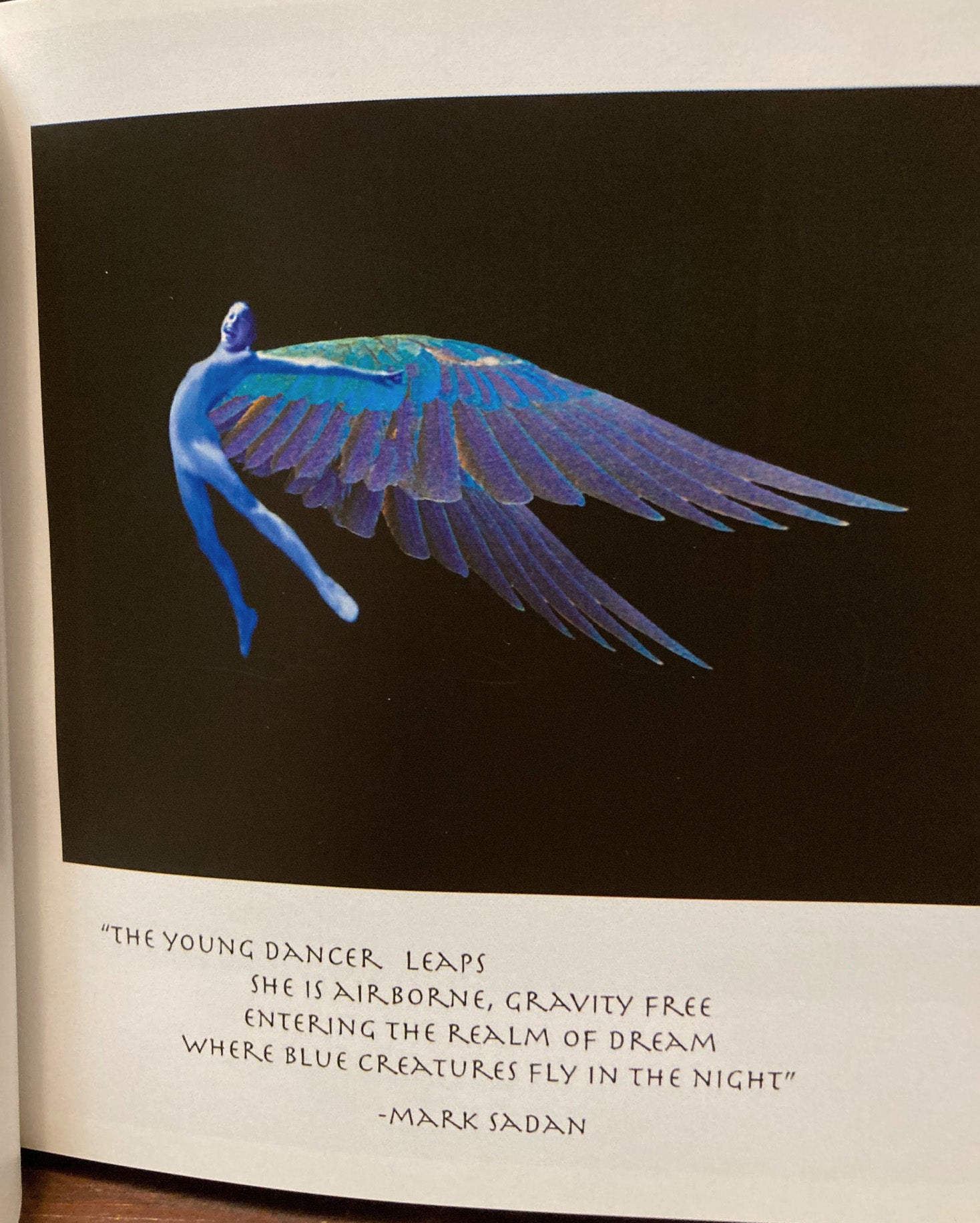 Self-published book, 2008. Small hardcover, clothbound, 20 pages, 9 full page color illustrations of angels with large wings, in flight or riding a swan. SIGNED and inscribed, "First copy for Gary...." on September 14, 2008. Issued in very limited quantity.