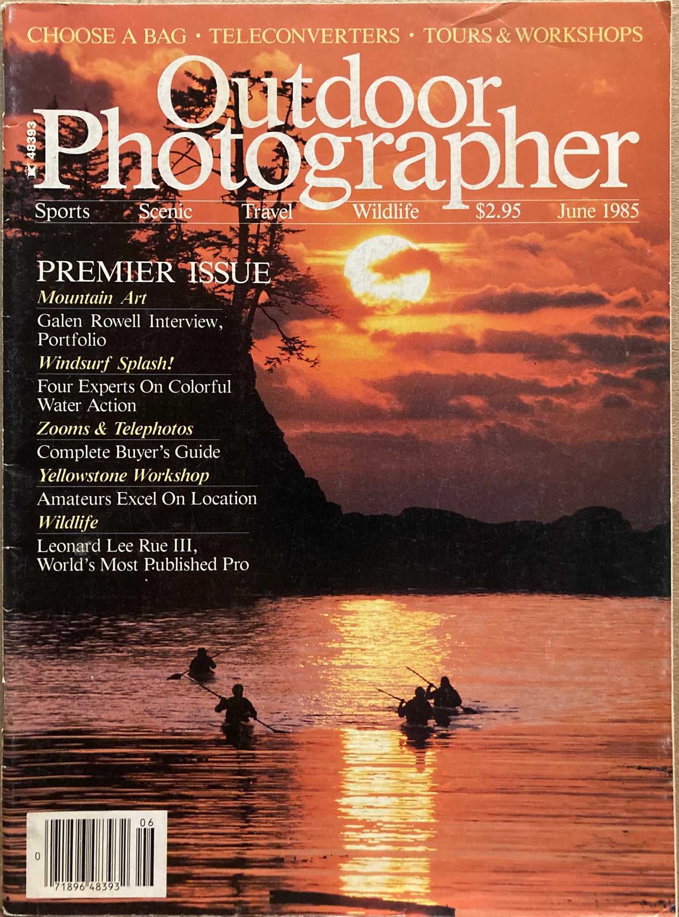 ... to bring home sky-high mountain photography, from 'California's Sierras to Nepal and Tibet,'" by Steven Werner, in Outdoor Photographer, June 1985. Premier issue of magazine, article on pages 24-31, 68-69, 73. [Extensive interview with Galen Rowell (1940-2002), one of the great mountain photographers before his untimely death, illustrated with color photographs. Entire issue of magazine, 74 pages. Also includes article with photographs of wild animals by Leonard Lee Rue III, characterized as "the foremost wildlife photographer," with text by Rue. Very good with minor signs of use, no marks.