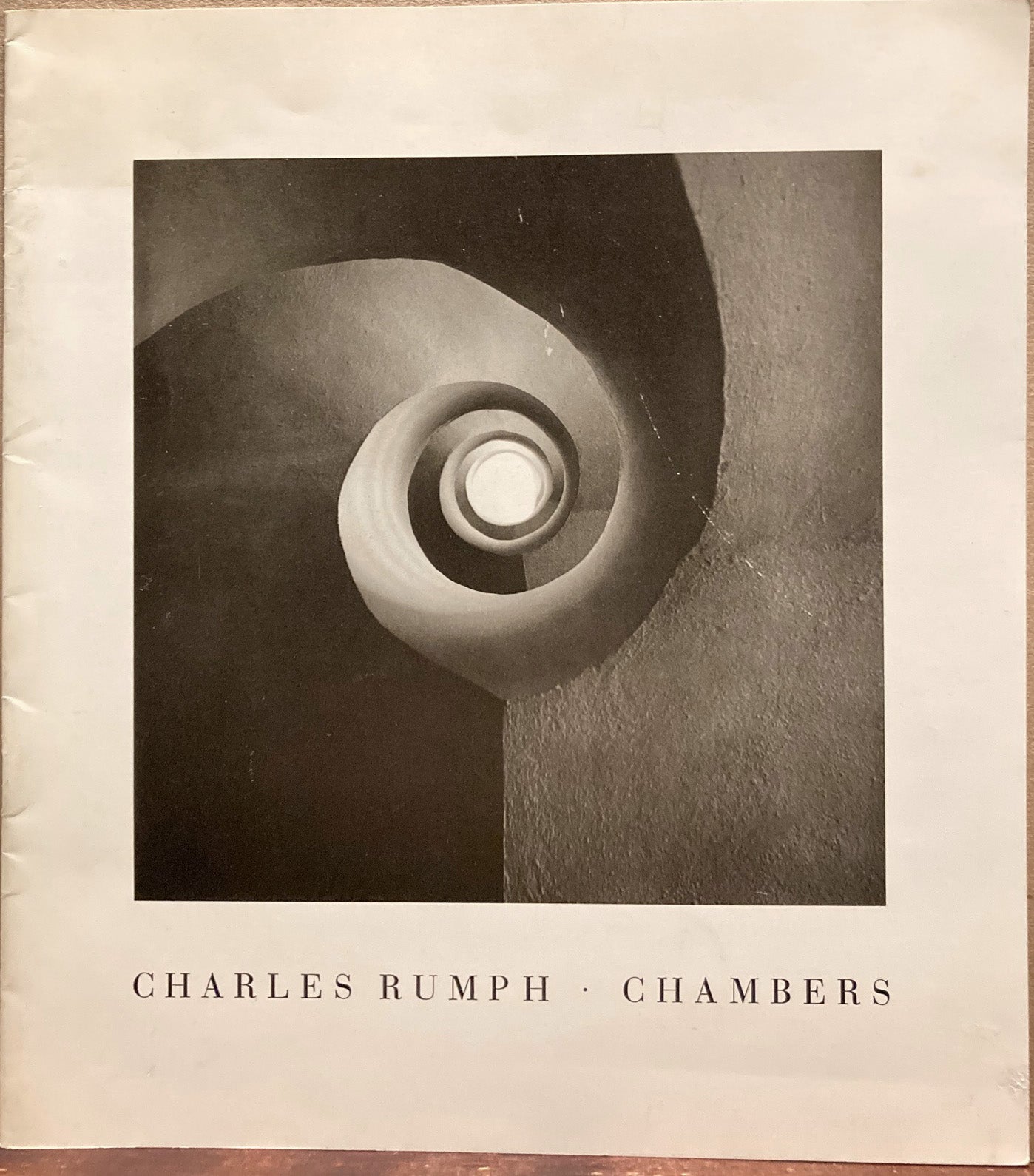 The Phillips Collection, Washington, D.C., 1980. Exhibit catalog, illustrated stapled wraps, 17 pages, 11 black-and-white plates of details taken in building interiors, checklist of 73 works, chronology of photographer's life. Essay by David Tannous on Rumph's connections to the formalist tradition in photography exemplified by Edward Weston. Edition of 1,500 copies printed by Meriden Gravure. [Rumpf began his career as a musician and rodeo performer, then after getting a law degree, served as Deputy Attorney General, State of California. His photographic career began in the 1970s and after winning prestigious awards, he established his own photography business in 1978, specializing in photography of art and architecture, and lecturing on photography. ] Very good with small abrasion spot near edge of front cover, otherwise fine.