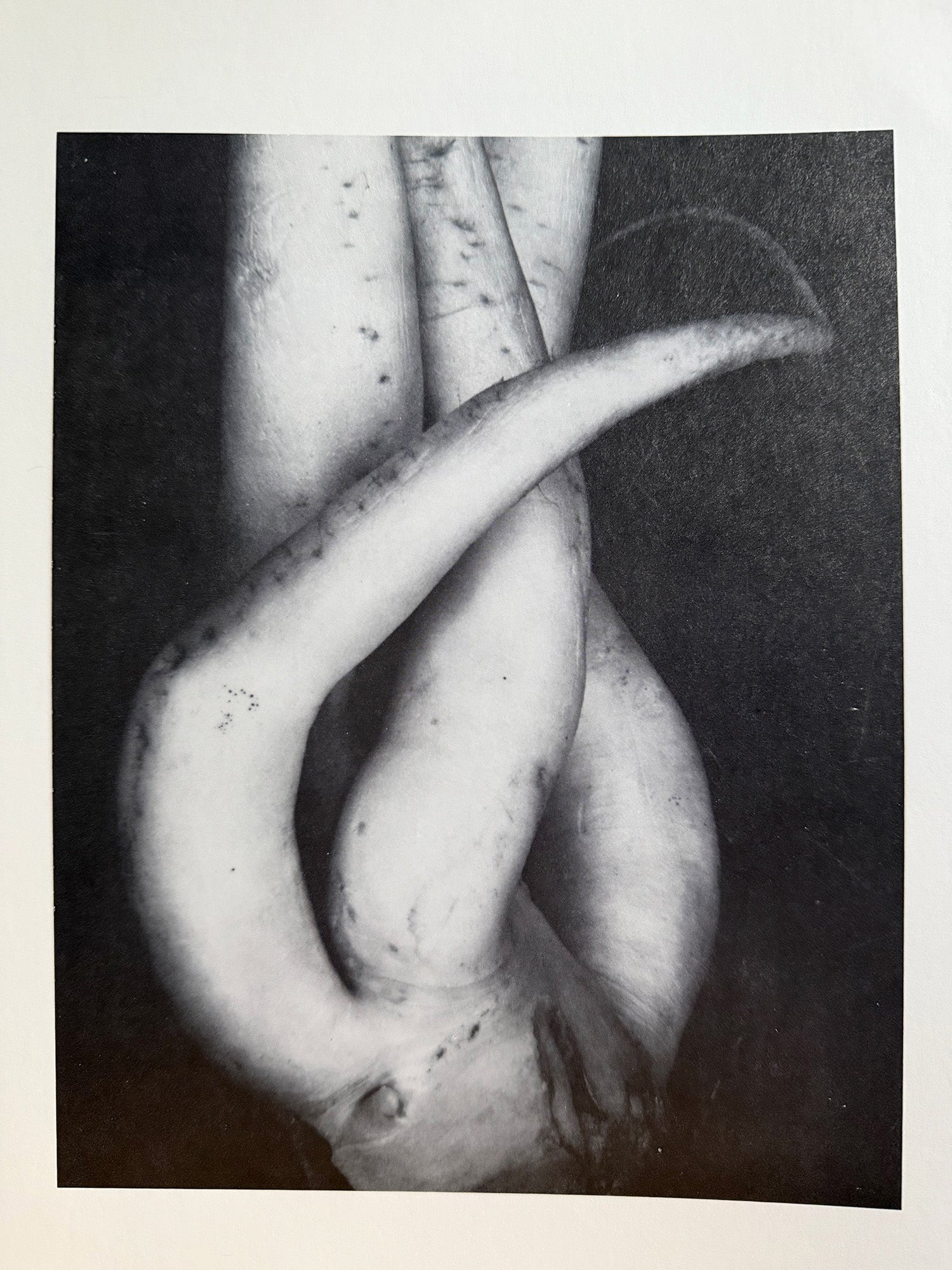 Arizona State University, 1979. Curated by Mary Virginia Swanson. Edited by Kermit Lee. Illustrated catalog for exhibition of photographs by famous photographers from the collection of the Minneapolis Institute of Arts. Biographies provided for each photographer. Seven full-page illustrations for seven of the photographers. Photographers, some who were featured in Camera Work, the magazine of the Photo-Secession, include Berenice Abbott; Paul Burty Haviland; Gertrudę Käsebier; Edward Steichen; Alfred Stieglitz; Paul Strand; Alvin Langdon Coburn; Frederick Evans; Walker Evans; Lewis Hine; André Kertesz; Jacques-Henri Lartigue; Arnold Newman; August Sander; Aaron Siskind; Edward Weston (see photo below of his “White Radish, 1933”). Spiral bound, near fine with trace evidence of paper clip top front edge. Very uncommonly found for sale. Not issued with ISBN number.