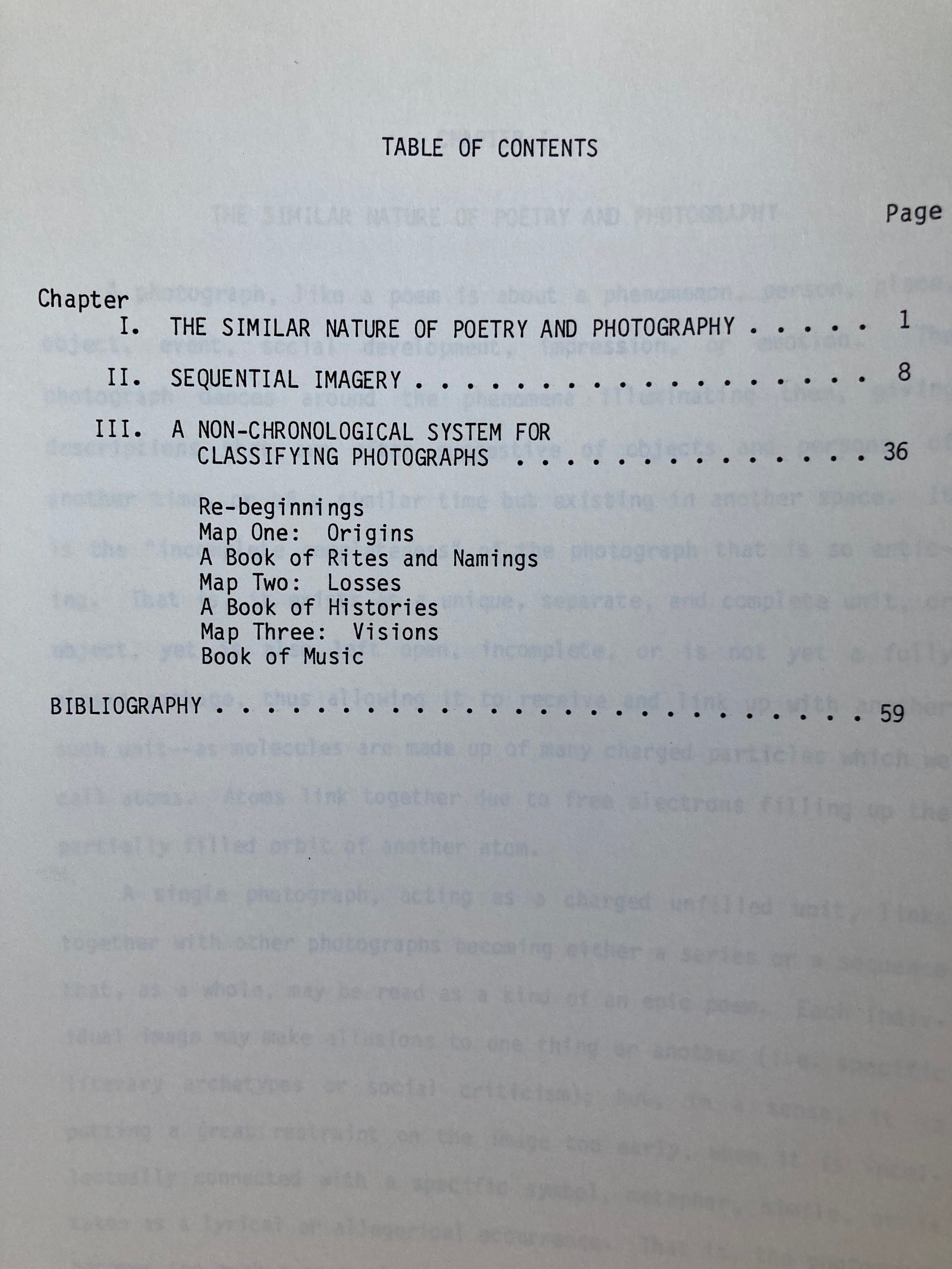 Arizona State University, 1978. Spiral bound, 61 pages, very good with bump on corner. Among photographers discussed in this work are Robert Frank, Minor White, Ralph Gibson, Alfred Stieglitz, Harry Callahan, and Les Krims. Uncommon, only a few copies in WorldCat. Table of contents included in photos below.