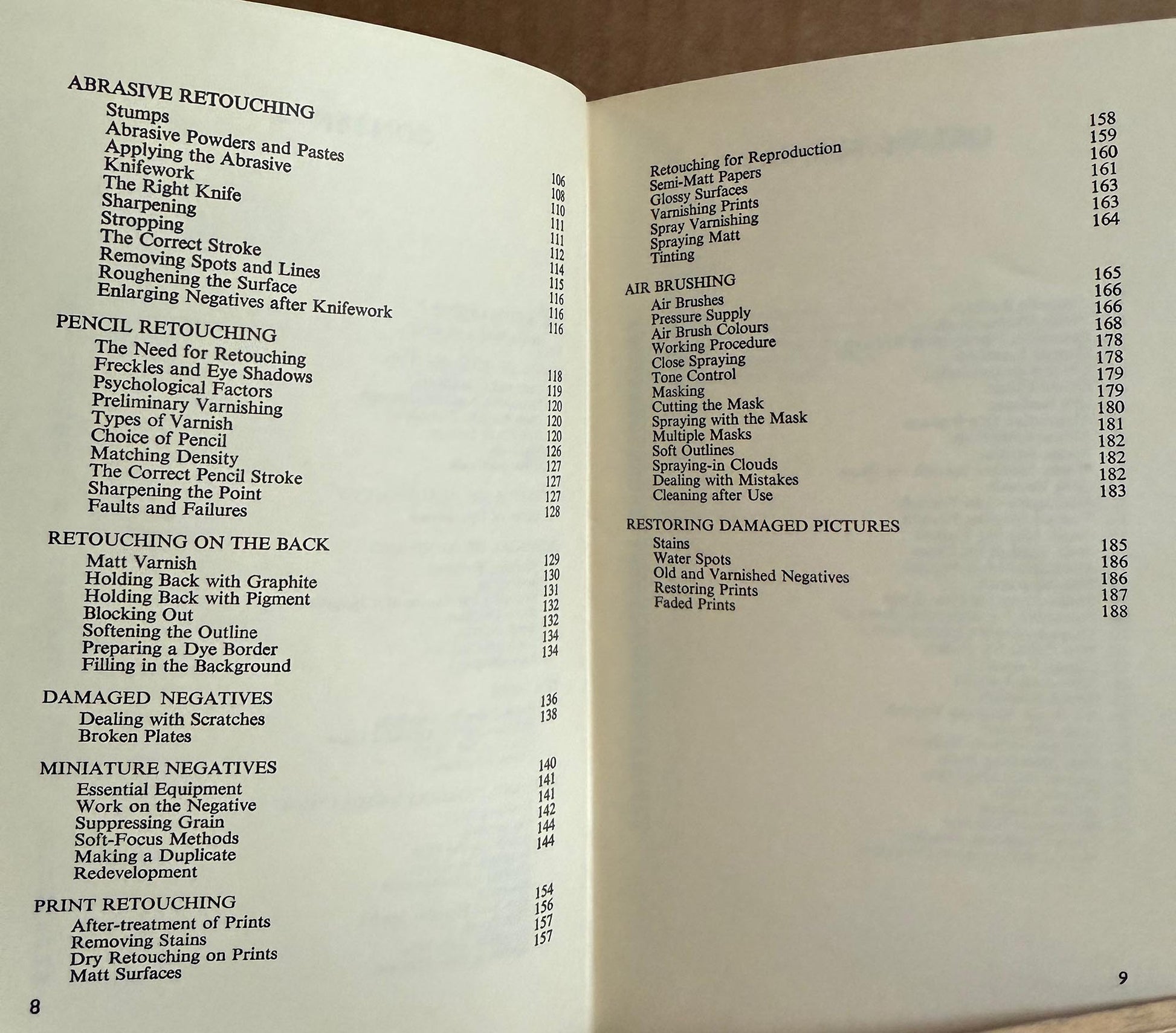 Focal Press, 1957. First impression of second edition (no later printings indicated, was reprinted). 200 pages. Black hardcover in cloth, lacks dust jacket, very good, small stains on flyleaves and fore edge. Includes chemical formulas for stain removal but did not try them on book. Includes retouching with chemicals, dyes, pigments, abrasion, pencil, etc., for negatives and prints. See photos of table of contents for details. Uncommon book for analog photography.