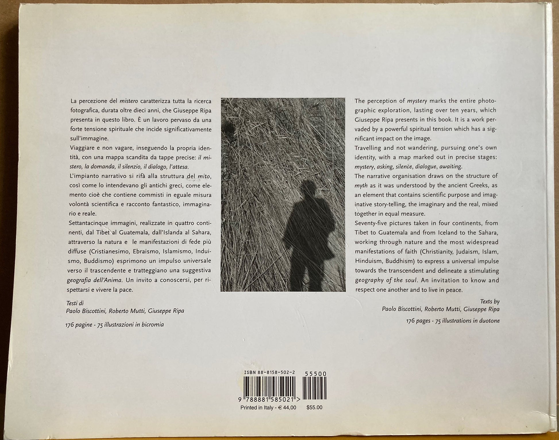 Charta, 2004. Text by Paolo Biscottini. Illustrated in black and white in 75 photographs taken over ten years by Giuseppe Ripa (born 1962) taken on four continents “from Tibet to Guatemala and from Iceland to the Sahara, portraying manifestations of faith (Christianity, Judaism, Islam, Hinduism, Buddhism) to express a universal impulse toward the transcendent….” First edition, published in Italy with text in both Italian and English. Wraps, as issued. Very good with small bump at bottom of spine and slight edge wear. 174 pages.
