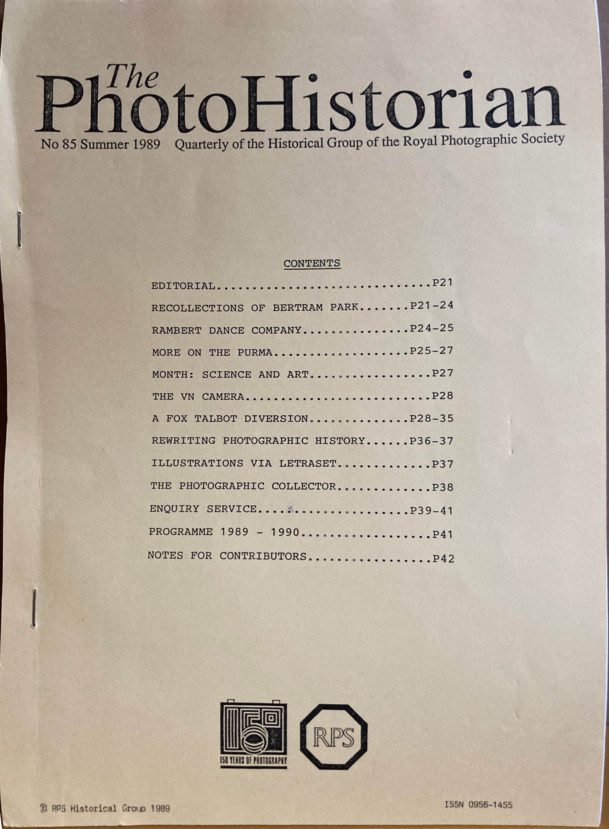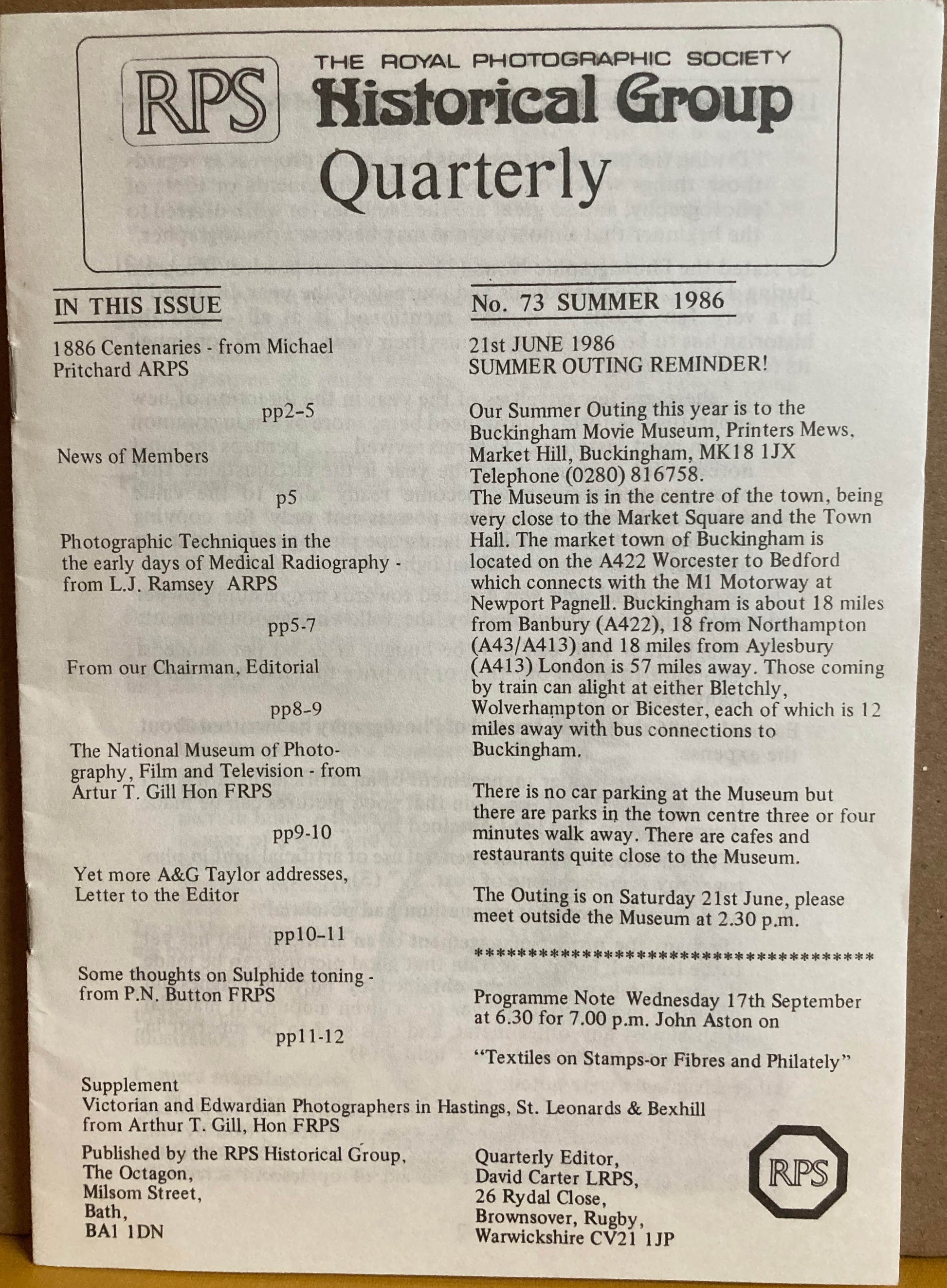 A collection of RPS publications, including RPS Pictorial Group Newsletter, September 1985, March 1987, and January 1992; annual reports of the RPS Council, 1985, 1987, and 1990; Catalogue of the Annual International Slide Competition and Exhibition, 1986-87; RPS Historic Group Quarterly, renamed the Photo-Historian in Spring 1989, from Summer 1986 to Winter 1992; folded poster about the National Centre of Photography and the Royal Photographic Society; and several other RPS items. Total 40 items, of which the Photo-Historian newsletters are the most substantial, some with 20 or more pages. Condition very good or better with some folded corners on the paper covers. Some of the topics and individuals covered in the historical newsletters include early medical radiology; history of the Société Lumière; cyanide poisoning; 1887 Centenaries by Michael Pritchard; Polaroid 160 Land Camera; Frederick Whaley, photographic artist; The Beato Brothers; The First Kodak Camera by Michael Pritchard; origins of the soft focus lens by Roy C. Hungerford; Sir Humphrey Davy; history of the Japan Camera and Optical Instruments Inspection and Testing Institute; Purma and VN Cameras; Cuthbert Bede; William Henry Fox Talbot; exotic portraits by dealer Ken Jacobson; J.B. Dancer's microphotographs; William Saunders, early photographer in China and Japan; early artificial light photography; Harold Edgerton and flash photography; Herbert C. Ponting; George Eastman by Chris Roberts, Kodak Archivist (two-part article); Eadweard Muybridge; Madame Yevonde; William Mortensen; and many more. Some newsletters include illustrations, the reproduction quality of which varies with paper used.