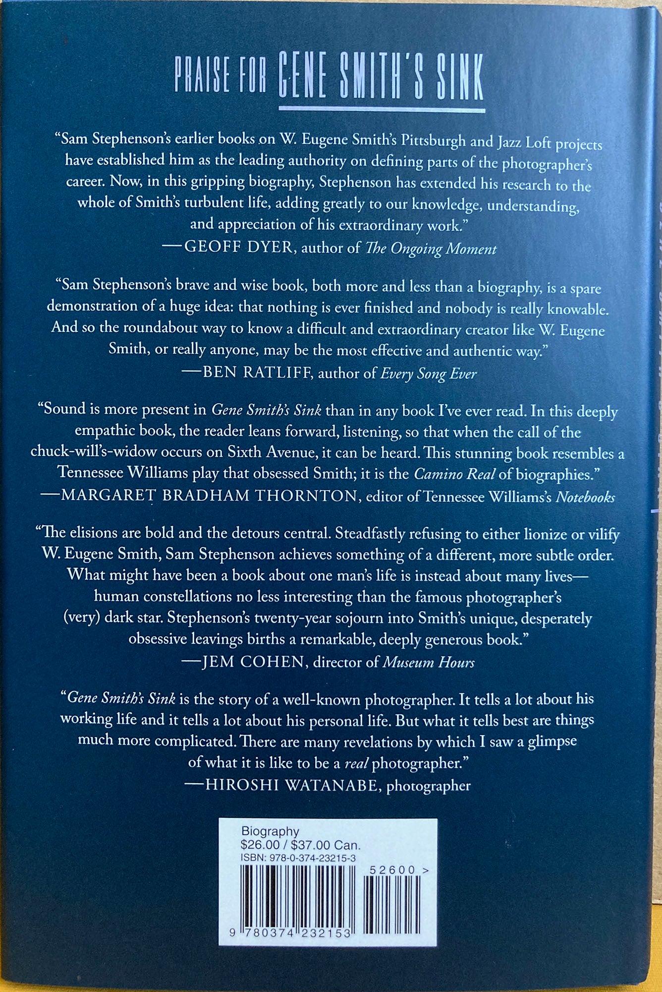 Farrar, Straus & Giroux, 2017. First edition, first printing, hardcover with dust jacket, as new. 207 pages. Stephenson here describes his research on W. Eugene Smith, especially during the years he lived in New York at what became known as “The Jazz Loft” and Smith’s work in Minamata, Japan, where he was severely injured. Based on numerous interviews, this book also involves other photographers such as Aileen Mioko Smith, Harold Feinstein, Larry Clark, and Jim Karales, and musicians such as Hal Overton, Thelonious Monk, and Ronnie Free. Not illustrated. This book is a kind of sequel to Stephenson’s The Jazz Loft Project (2009), which was made into a feature film starring Johnny Depp in 2015. Stephenson is also the author of Dream Street: W. Eugene Smith’s Pittsburgh Project (2001). Issued at $26.