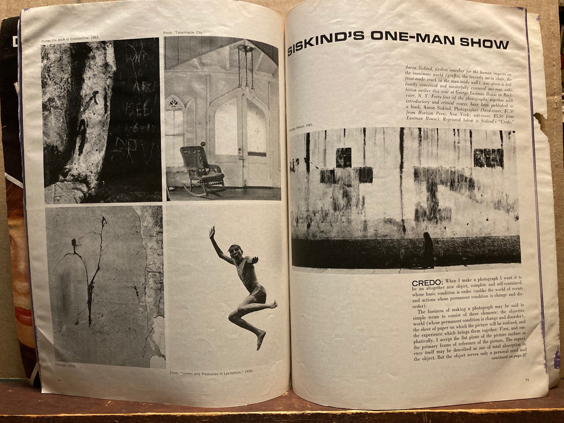 Includes Siskind's "Credo," reprinted from Aaron Siskind: Photographer, with five photographs. Issue also includes "Shooting Without Stopping," pages 46-49 with five photographs by W. Eugene Smith. Entire issue, 136 pages. Fair with chips, inked edge, and other signs of use, reading copy.