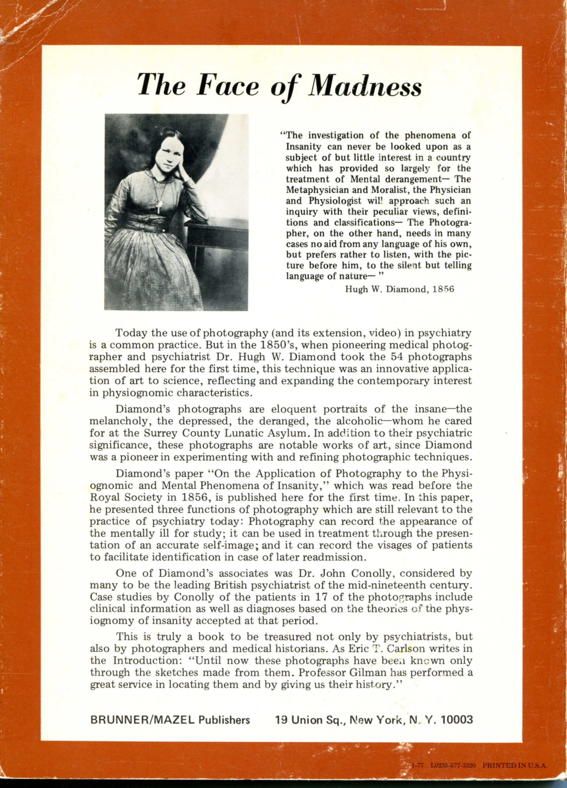 By Sander L. Gilman, ed., Hugh W. Diamond, and John Conolly. Brunner/Mazel, 1976. Psychiatry, mental illness, and portraits of patients in the nineteenth century. Wraps, good with creases to corners of cover and wear to extremities. Not to be confused with later reprints.