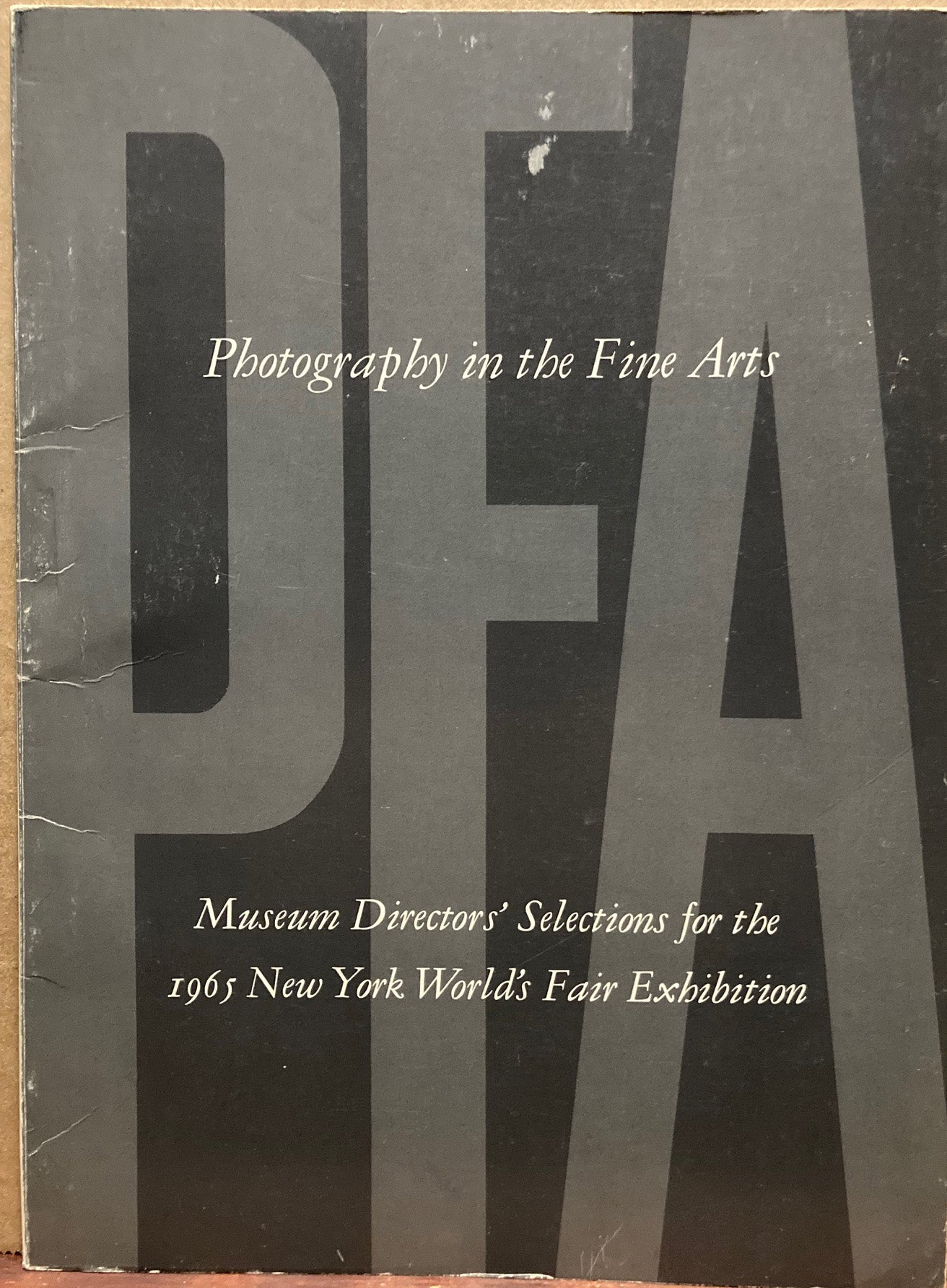 PFA, 1965. [Catalog for N.Y. World's Fair PFA exhibit at Kodak pavillion. Includes portraits by Yousuf Karsh and of Karsh at work by Dmitri, checklist, 20 other photographic illustrations by Richard Avedon, Bert Stern, John Brook, Cornell Capa, Elliot Erwitt, Ernst Haas, Philippe Halsman, Karsh, Inge Morath, Arnold Newman, Irving Penn, John Szarkowski, Brett Weston, et al. Near fine, some foxing on rear cover.