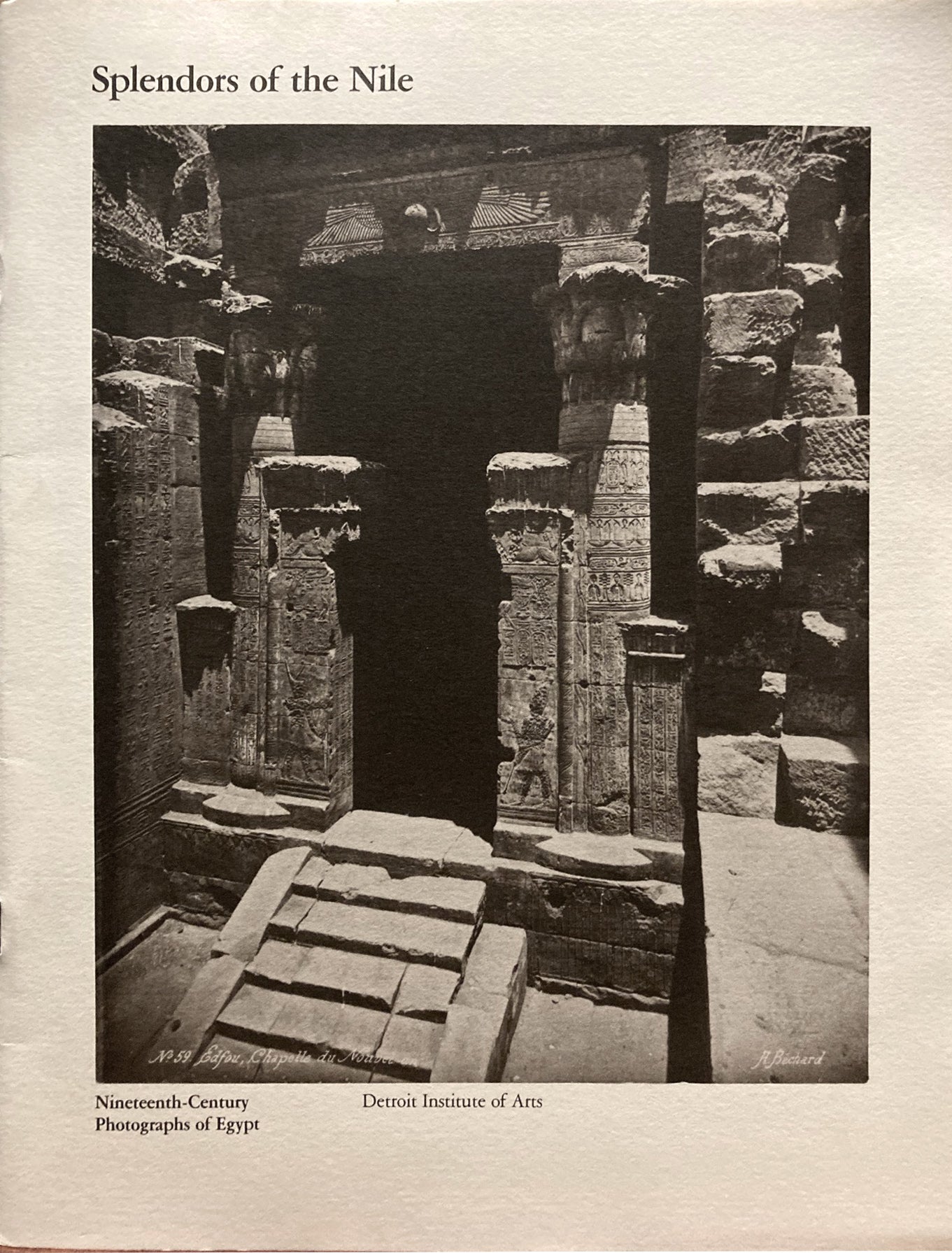 Detroit Institute of Arts. February 21st - May 7th, 1989. Founders Society, Detroit Institute of Arts, 1989. Exhibit catalog, stapled wraps, 20 pages. Eleven sepia illustrations, with two essays by William H. Peck and Martha Mardirosian. Foreword by Christine Swenson. Map and checklist of 102 19th century photographs of Alexandria, Cairo, Giza, Memphis, Beni Hasan, Asyut, Abydos, Dendera, Luxor, Esna, Edfu, Kom Ombo, First Cataract, Philae, Dendur, Wady El Sibu, Abu Sibel, Second Cataract, and general views. Photographers illustrated: Antonio Beato; Maison Bonfils; C. & G. Zangaki; Henri Bechard; and Adolphe Braun. 2,000 copies printed on Mohawk Superfine. 8 1/2 x 11inches. Fine.