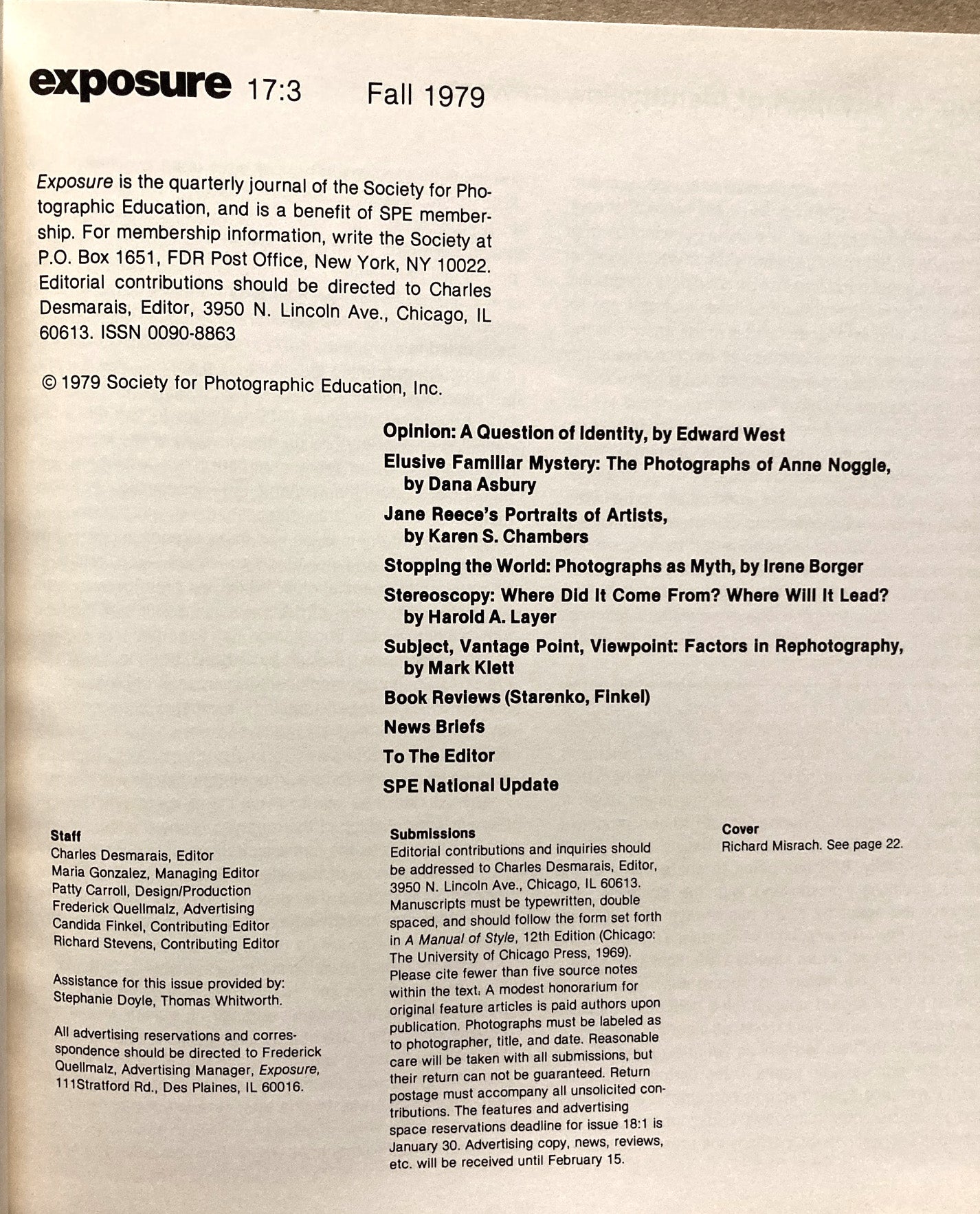 Exposure, Journal of the Society for Photographic Education, 17:3, Fall 1979. Anne Noggle, Jane Reece, Mark Klett, et al.