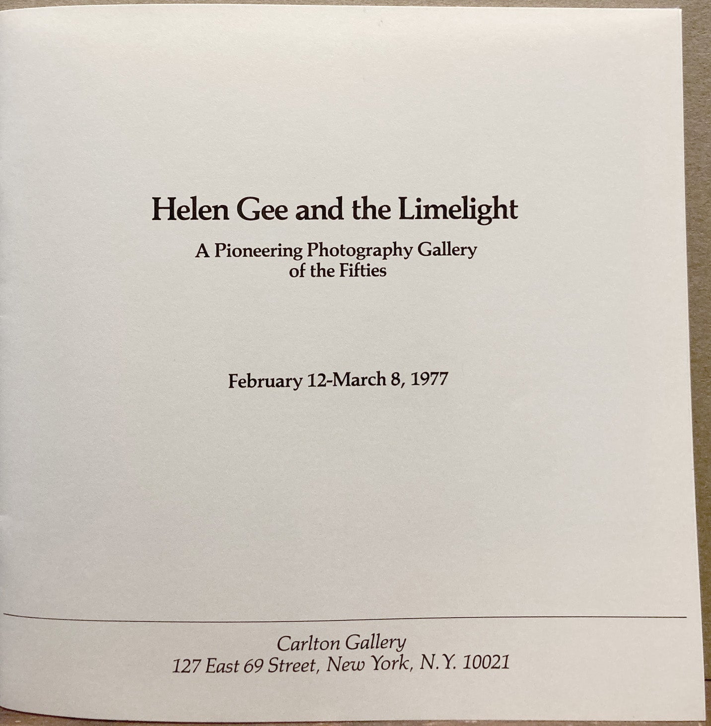 February 12-March 8, 1977. Carlton Gallery, New York. Essay by Peter C. Bunnell. Wraps, 20 pages. Includes illustrations by Paul Strand, Moholy-Nagy, Edward Weston, Leon Levinstein, W. Eugene Smith, Eugene Atget, Edouard Boubat, Aaron Siskind, Alfred Stieglitz, Berenice Abbott, Lisette Model, Robert Frank, and Wynn Bullock, plus list of Limelight exhibitors in individual and group shows and chronology of exhibitions, 1954-1961. Wraps, like new, without the fading to covers sometimes found.