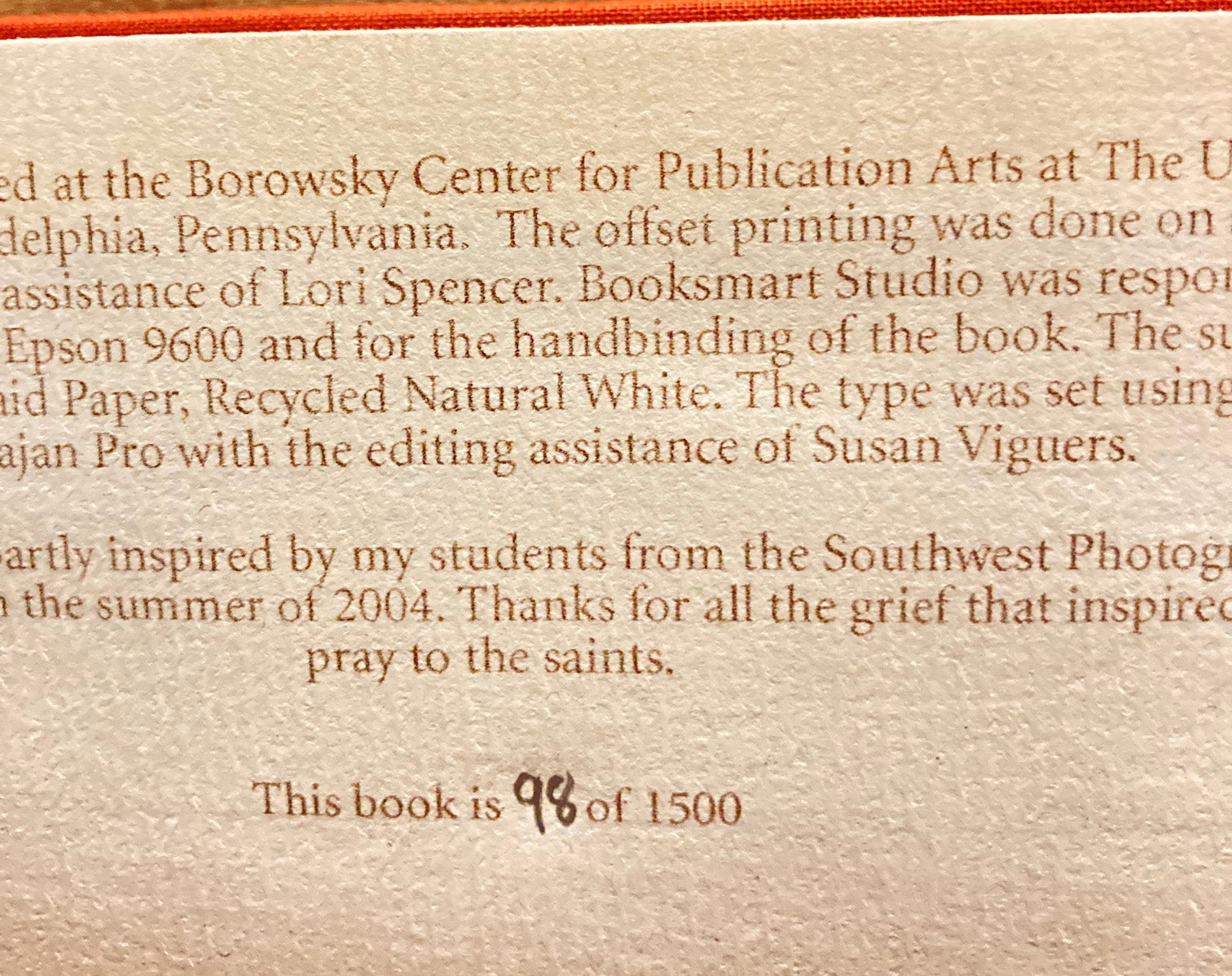 Booksmart Studio, 2004. #98 in an edition of 1,500 (although it is likely that far fewer copies were produced). Oblong cloth bound artist's book, 42 pages, clothbound, with maps and fold-out two page panoramic black-and-white landscape photographs. [Eric Kunsman, owner of Booksmart Studio, a custom printing firm in Rochester, New York, has taught photography at Mercer County Community College, New Jersey, the Rochester Institute of Technology, and other institutions. He has exhibited widely throughout the U.S. According to Kunsman, "This book was partly inspired by my students from the Southwest Photography Workshop held in the summer of 2004."]
