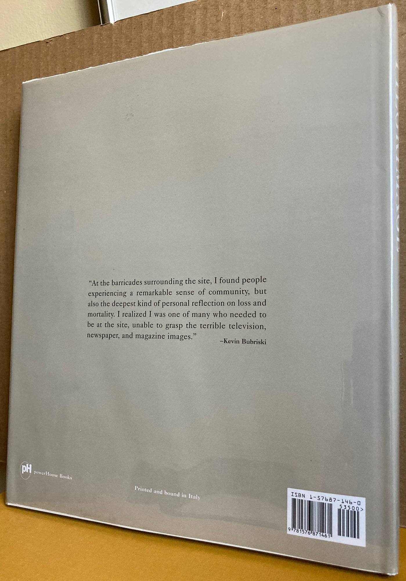 powerHouse Books, 2002. First edition, hardcover, fine with fine protected dust jacket, like new. Photographs in black and white by Bubriski of people at the site of the World Trade Center in Manhattan after its destruction on September 11 in an attack by terrorists. Afterword by Richard B. Woodward. 96 pages. Bubriski, whose photographs are in numerous major museums such as the Museum of Modern Art and the Metropolitan Museum of Art, made five trips to the WTC site from his home in Vermont to make this body of work, the first two weeks after the attack and the last on December 19, 2001. He wrote, “each visitor’s quiet moment of reflection began as he or she stared off at th awful, cascading ruin of twisted steel, stepped in a swirl of acidic smoke. In this silence most visitors appeared to finally gasp, visually, the horror.” Without showing the ruins, Bubriski creates here a moving document of the tragedy as seen through the reactions of onlookers.