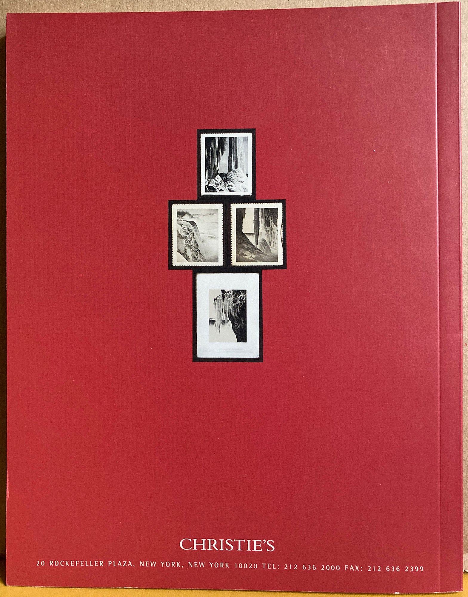 Like new. Wraps, 234 pages. All 391 lots illustrated, major names in photography: Berenice Abbott, Herbert Bayer, Erwin Blumenfeld, Margaret Bourke-White, Bill Brandt, Brassai, Frantisek Dritikol, Pierre Dubreuil, Laura Gilpin, Johan Hagemeyer, Andre Kertész, Heinrich Kuehn, Man Ray, Paul Outerbridge Jr., Albert Renger-Patszch, Alfred Stieglitz, Paul Strand, Karl Struss, Josef Sudek, Edward Weston, Ansel Adams, Diane Arbus, Richard Avedon, Tina Barney, Wynn Bullock, Imogen Cunningham, Roy DeCarava, William Eggleston, Frederick H. Evans, Walker Evans, Robert Frank, Lee Friedlander, Nan Goldin, Emmet Gowin, Ernst Haas, Philippe Halsman, David Hockney, Gertrude Käsebier, Rudolf Koppitz, Josef Koudelka, Helen Levitt, Sally Mann, Robert Mapplethorpe, Charles Marville, Ralph Eugene Meatyard, Leonard Misonne, Carl Moon, Vik Muniz, Eadweard Muybridge, Carl Mydans, Arnold Newman, Helmut Newton, Ruth Orkin, Gordon Parks, Irving Penn, Herb Ritts, Alexander Rodchenko, Lucas Samaras, August Sander, Ben Shahn, Charles Sheeler, Aaron Siskind, W. Eugene Smith, Frederick Sommer, Edward Steichen, Ralph Steiner, Thomas Struth, Josef Sudek, Maurice Tabard, J mes Van Der Zee, Andy Warhol, Brett Weston, Minor White, Joel-Peter Witkin, Max Yavno, and others.