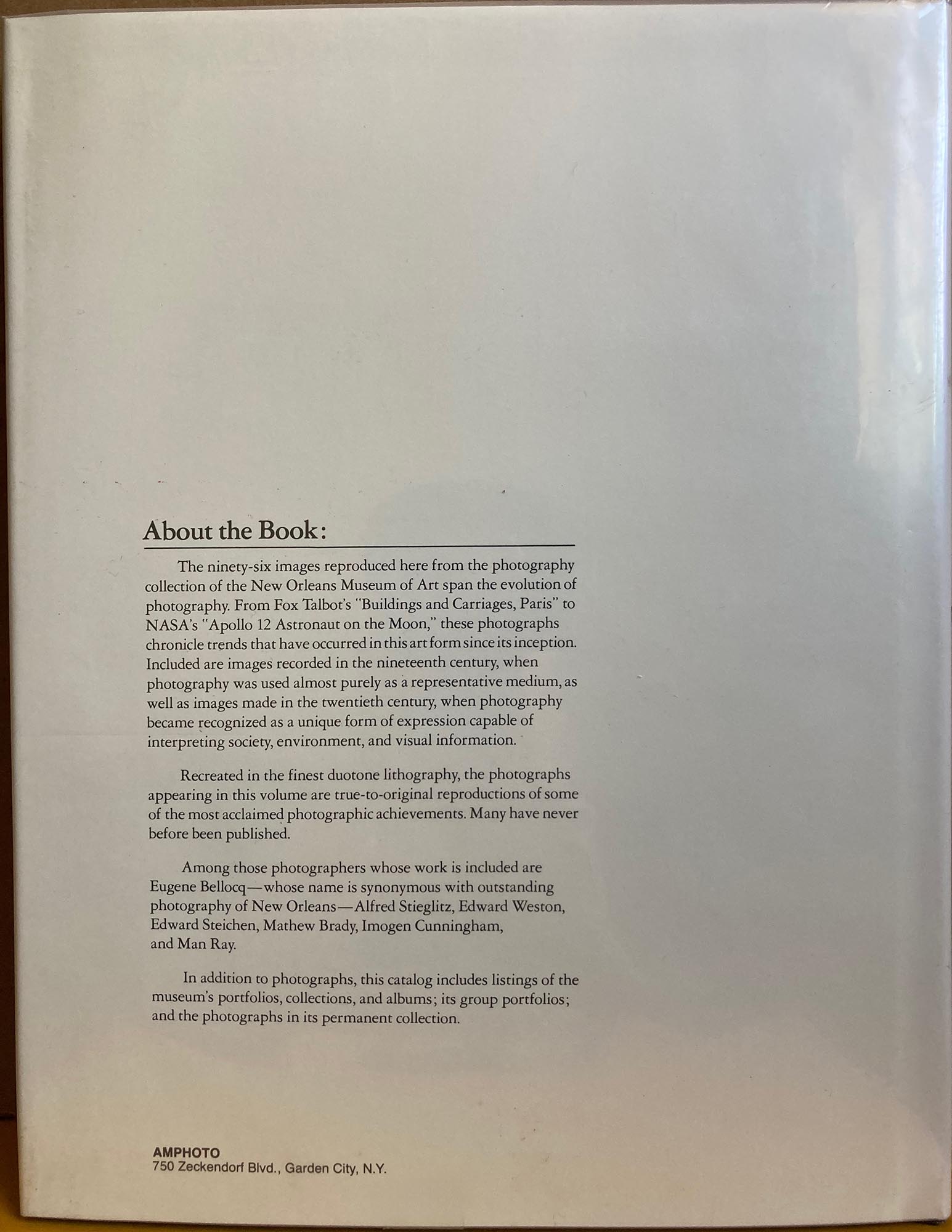 Amphora, 1979. Hardcover fine with fine protected dust jacket. 127 pages. Includes many unfamiliar images by well known photographers. Includes list of photographs in the holdings of the New Orleans Museum of Art. 96 photographs illustrated in black and white. Photographers include William Henry Fox Talbot,Adolphe Braun, Felice Beato, Felix Bonfils, Francis Frith, Nadar, David Octavius Hill and Robert Adamson, Julius Vannerson, John K. Hillers, Timothy O’Sullivan, Julia Margaret Cameron, Charles Spitz, Paul B. Haviland, Morgan Whitney, Frederick Evans, Gertrude Kasebier, Andre Kertesz, Laszlo Moholy-Nagy, Eugene Atget, Berenice Abbott, Robert Frank; MathewBrady, Man Ray, William C. Odiorne, Josef Sudek, Charles Job, Eva Watson-Schutze, Edward Weston, Edward Steichen, Imogen Cunningham, Emil Hoppe, Baron Adolf DeMeyer, John G. Bullock, Lewis Hine, Margaret Bourke-White, Lewis Hine, Ilse Bing, Arnold Genthe, Alfred Stieglitz, Ralph Steiner, Francis Bruguiere, Maurice Tabard, Jaromir Funke, Robert Doisneau, Paul Outerbridge, Lee Miller, Herbert Bayer, Mark Feldstein, Eugene J. Bellocq, Doris Ullman, Clarence John Laughlin, Morton Schamberg, James Van Der Zee, August Sander, and many others. Also published in a different edition by University of New Mexico Press.
