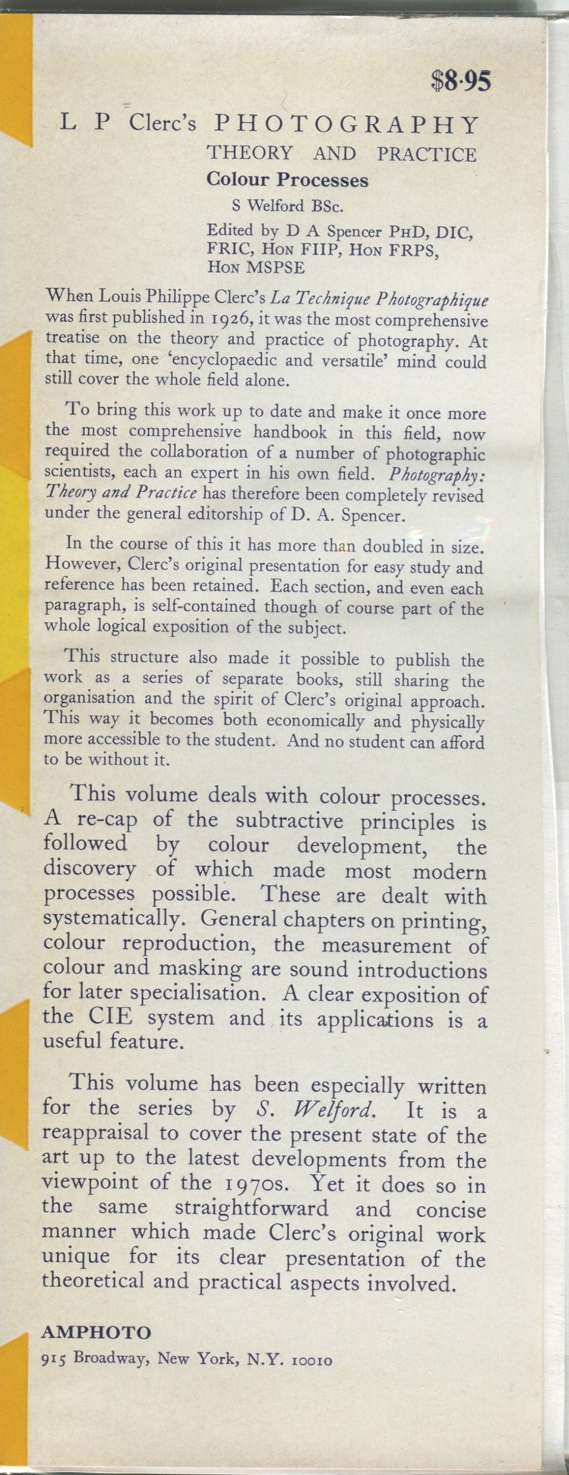 Volume 6 in the series. This volume by S. Welford. AMPHOTO, 1971. The U.S. edition prepared by Focal Press in the UK. Hardcover in gray cloth, like new with near fine protected dust jacket that is age-toned on the inside. Originally published in one volume in 1926 by Louis Philippe Clerc as La Technique Photographique, it was first issued in an English edition in 1930 and reprinted several times. This thorough update and complete revision of his seminal work on photochemistry and related topics required multiple authors and volumes, of which this is the one on color photography, expanding on the basic principles provided in Volume 1, Fundamentals. Here Welford provides details in chapters on chromogenic development, dye transfer processes, sensitometry, reversal transparencies with incorporated color couplers, color negative processes, color papers, printing color negatives, processing (including equipment), prints from transparencies, silver dye-bleach processes (like Cibachrome), Polacolor, image properties, perception and the reproduction of color, measurement of color, masking to improve the quality of reproduction, et al. Illustrated with numerous diagrams, charts, etc. This book is quite uncommon in hardcover with dust jacket except for ex-library copies lacking the dust jacket.