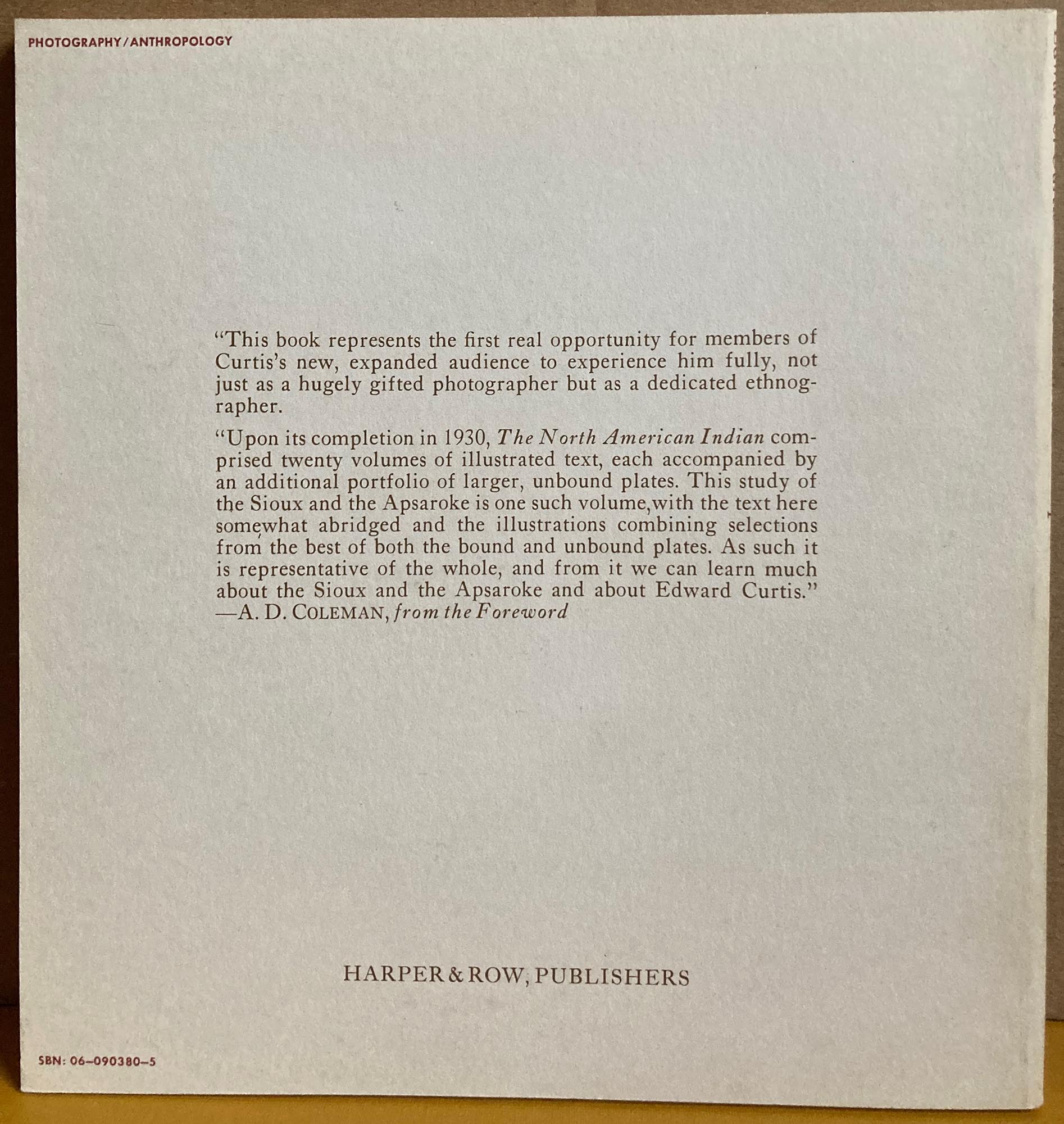 Harper Colophon, 1975. Wraps, like new with custom-made polyester protector. Edited by Stuart Zoll with Foreword by A.D. Coleman. 105 pages. This book is illustrated with Curtis’ photos but the reproduction quality is better in other publications. What distinguishes this work is Coleman’s informative introduction reviewing scholarship about Curtis and Curtis’ texts in Volumes 3 and 4 of his twenty volume magnum opus, The North American Indian, completed in 1930. In addition to being a skilled photographer, Curtis was an ethnographer and here details Native American customs, such as courtship and marriage.