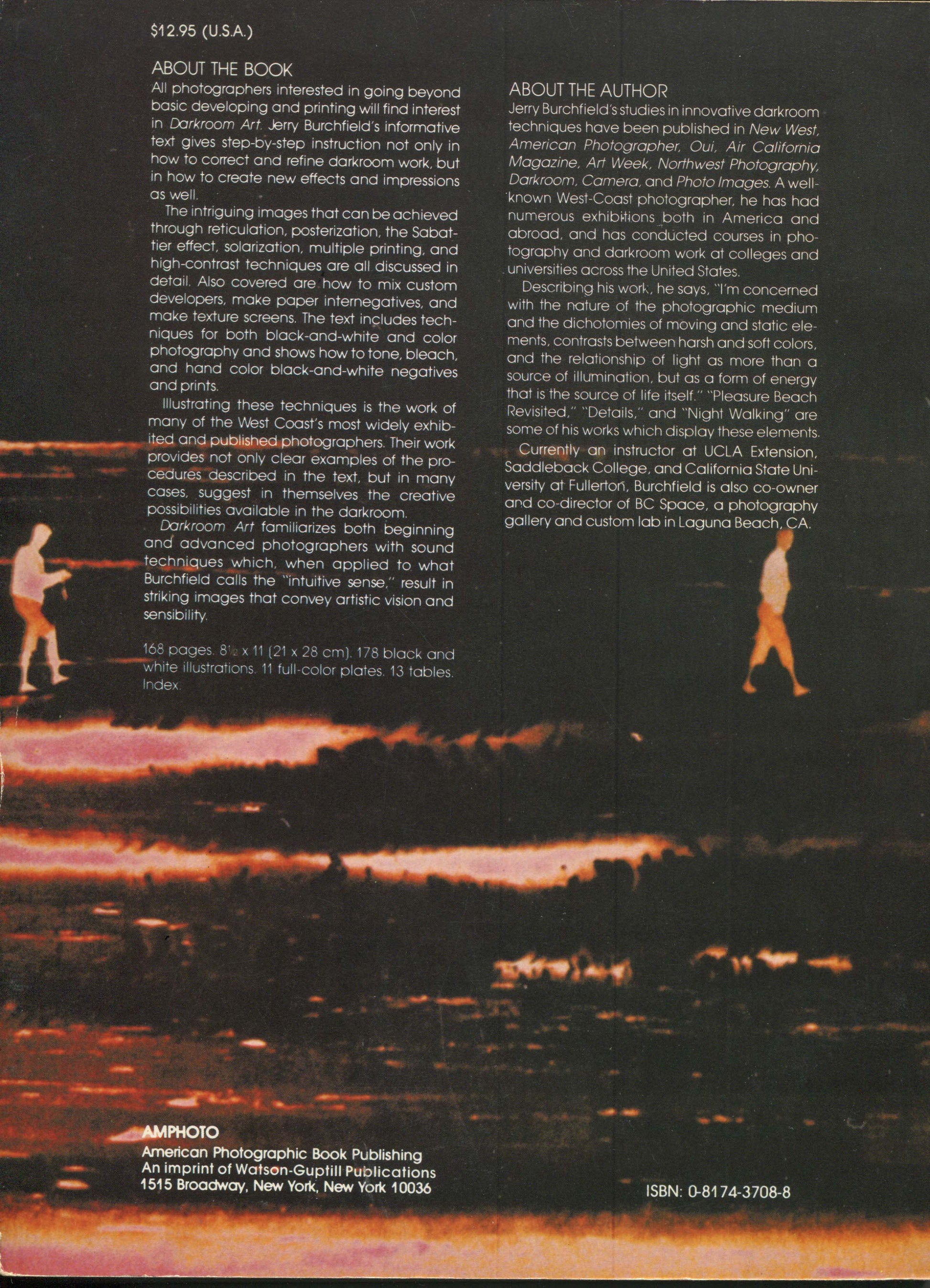 AMPHOTO, 1981. Near fine in wraps with tiny spots of wear near top of spine. 160 pages. Although intended for the analog photographer, this book is a fine reference for art historians and curators who need information about unusual darkroom printing techniques. Chapters on film processing alternatives and special effects; creative alternatives with processed negatives and slides; photograms; basic print variations; making oversize prints; darkroom magic, including Sabattier Effect on black-and-white and color prints; multiple images; high-contrast techniques; posterization; and altering the finished print. Well illustrated, mostly by Burchfield, with other photos by Barbara Kasten, JoAnn Callis, Robert Routh, Karen Truax, P.W. Derby, Jeff Gates, Mark Chamberlain, Sheila Pinkel, DeAnn Jennings, Bill Collins, Dinah Portner, Holly Wright, Laurie Brown, Keith Nakata, et al.