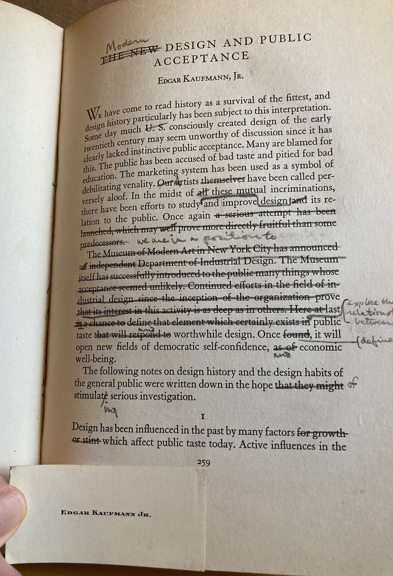 New Directions, 1940, Edited by James Laughlin. Includes preview excerpts of James Agee & Walker Evans, Let Us Now Praise Famous Men with four illustrations by Evans, and Wright Morris, The Inhabitants, with 15 photos. Other contributions by Paul Goodman, Weldon Kees, Alfred Young Fisher, Katherine Anne Porter, George Orwell, Parker Tyler, Edgar Kaufmann Jr., Frank Lloyd Wright (with illustrations of Taliesin West), John Peale Bishop, et al. Also a large section on Surrealism with contributions by Surrealist artists and writers, such as Louis Aragon, Hans Arp, Andre Breton, Nicholas Calas, Paul Magritte, Pablo PIcasso, Tristan Tzara, and many others. 579 pages. This copy belonged to one of the authors, Edgar Kaufmann Jr. (1910–1989), American architect, lecturer, and author, with his card laid in and his revisions in pencil to his essay. “The New Design and Public Acceptance.” (Kauffman's parents lived in the Frank Lloyd Wright designed house, Falling Water.) Very good in hardcover, beige cloth, spine darkened. Custom made 4-mil polyester jacket.