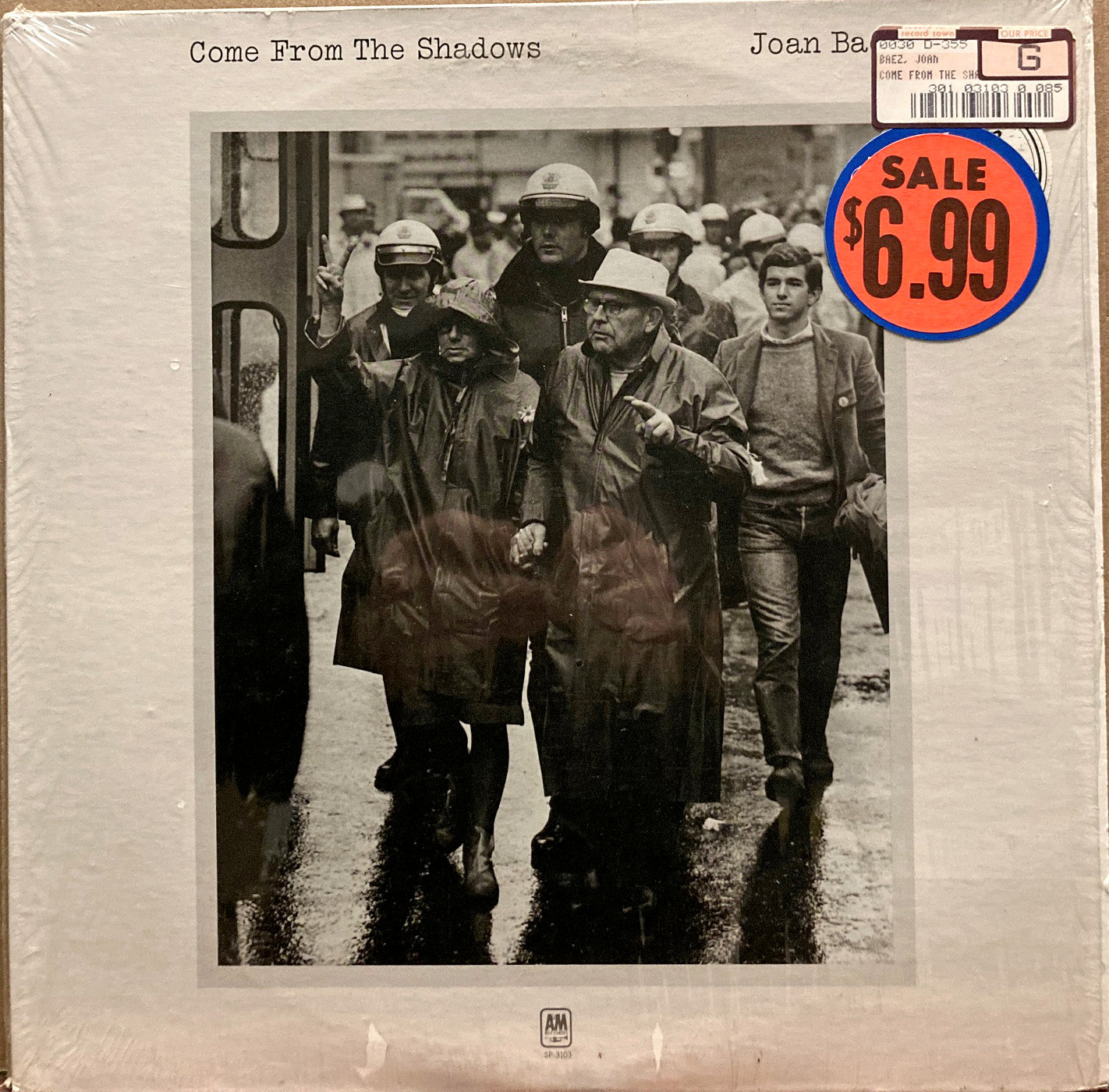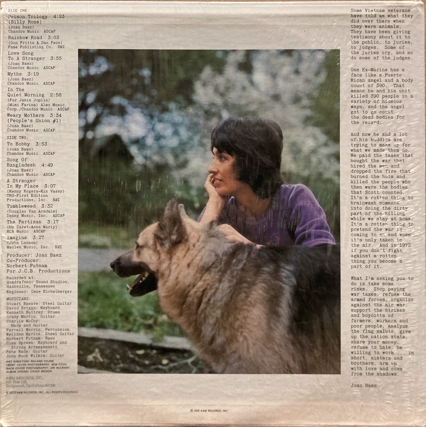 A&M, SP-3103. Steve Fitch photo on cover of peace marchers. [Fitch's work appeared in Modern Photography Annual '70.] Photo of Baez and the back of jacket by Jim McCrary. This folk music album by Joan Baez is in excellent condition. Disc is like new and jacket still has original shrink wrap opened at one end to enable retrieving the disc. Housed in archival quality clear polypropylene sleeve. Back of jacket with Baez' statement expressing sympathy for Vietnam veterans and urging people to end the war through non-violent actions such as stopping to pay war taxes. See photo for song list.