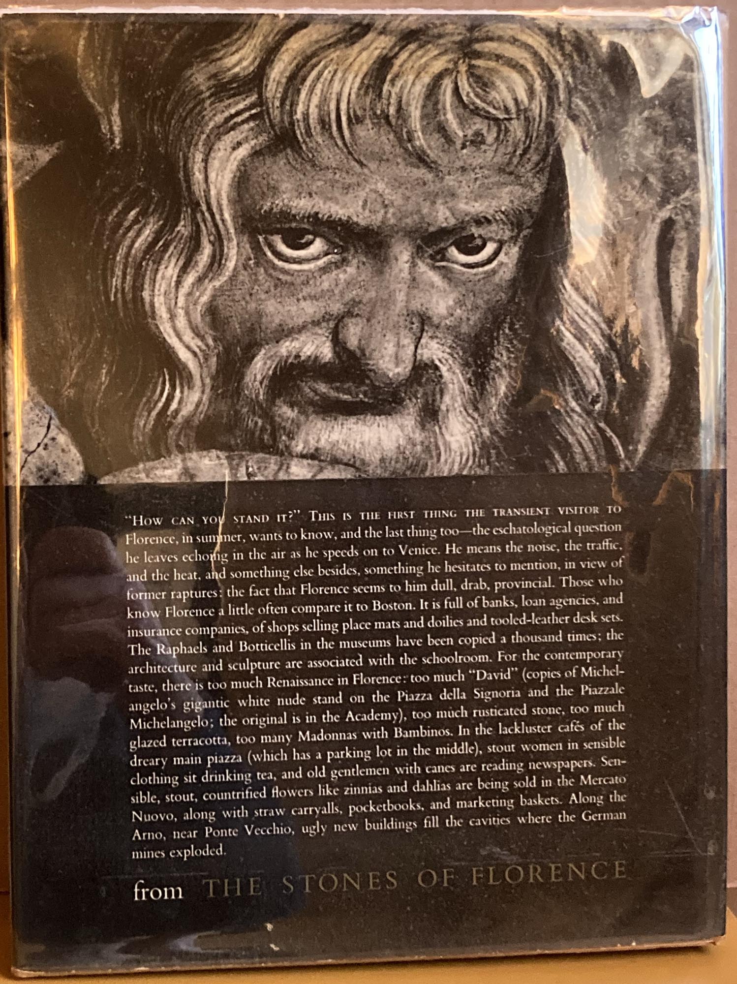 Harcourt, Brace, 1959. First edition, in hardcover, ochre cloth, near fine with near very good protected dust jacket with a spot of wear at bottom left of front panel, a bit of wear at spine tips, and tanning at edges of inside panels. Undated with HB logo on copyright page. Printed In Zurich, Switzerland. 130 pages. Most photographs by Evelyn Hofer, with some by Alinari and others. Hofer (1922-2009) spent four months in Florence working with a large format camera to make the black and white photographs for this book, which was published simultaneously by William Heinemann in London and reprinted several times in the 1960s, 1970s, and 1980s. First in a series of Hofer’s collaborations with distinguished writers about cities around the world, including Washington, DC, Dublin, New York, and London. A movie about Hofer is available on YouTube at https://www.youtube.com/watch?v=hOJy4E5mH9E