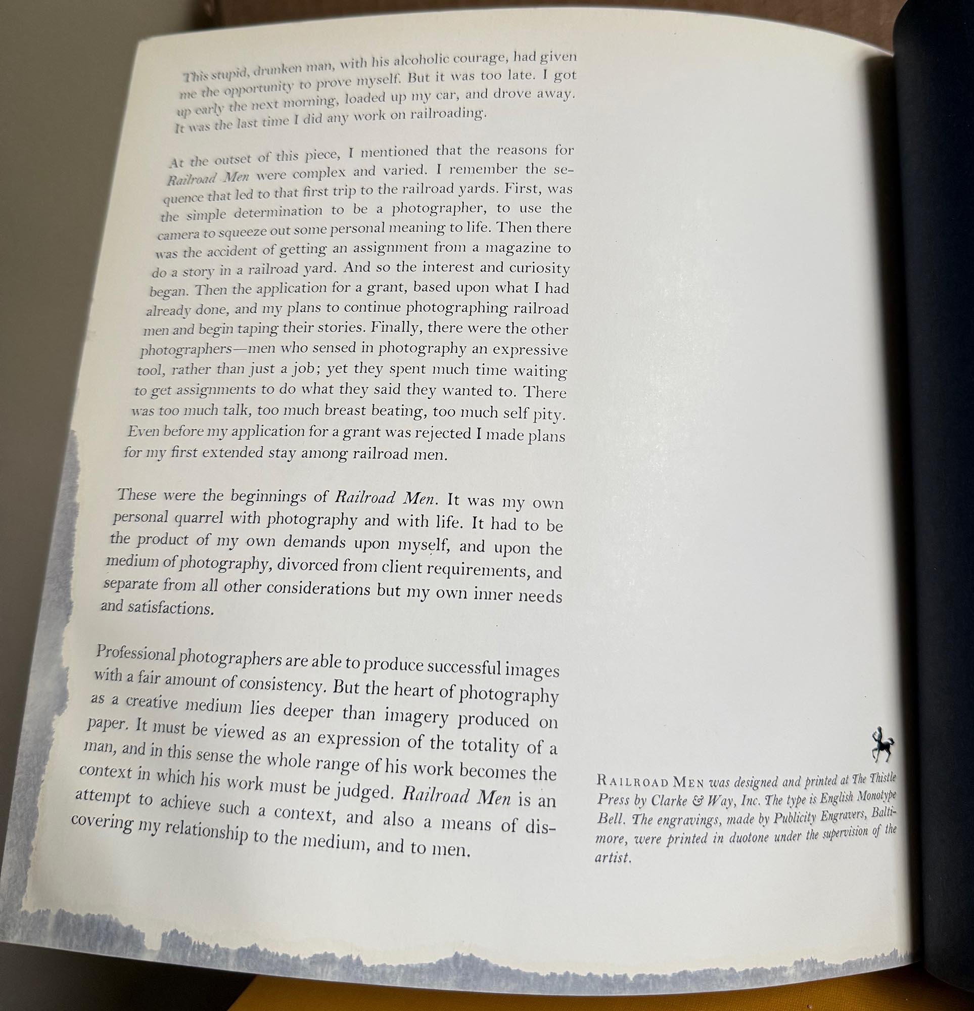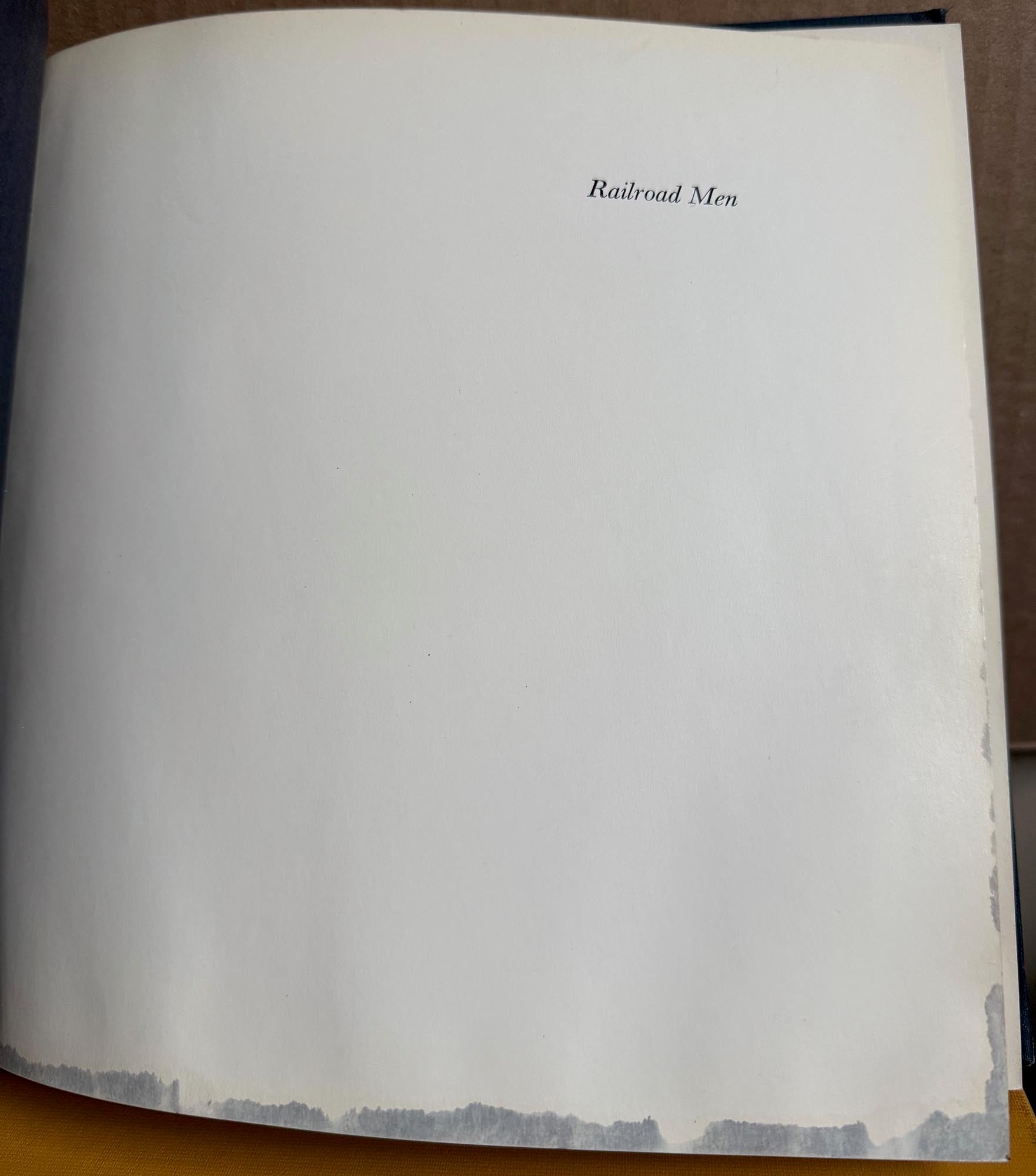 Clarke & Way, 1962. Dark blue cloth, spine lettering worn, first and last pages stained at bottom transferred from adjacent black flyleaves (see photos). Other pages without stains. More than 40 photos of railroad workers at work and leisure, plus a few railroad scenes. No dust jacket. Jonathan Williams commented on Railroad Men, “I know of no book since Wright Morris' The Inhabitants that gives us more of the honesty of a group of people.”