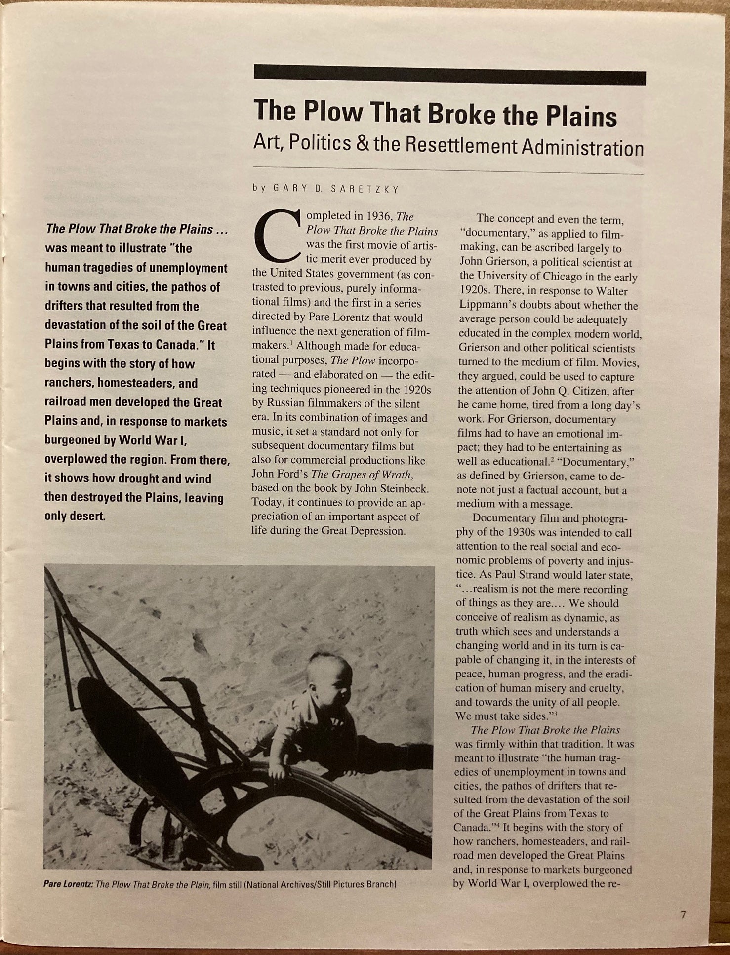 "The Plow that Broke the Plains: Art, Politics & the Resettlement Administration," by Gary D. Saretzky.