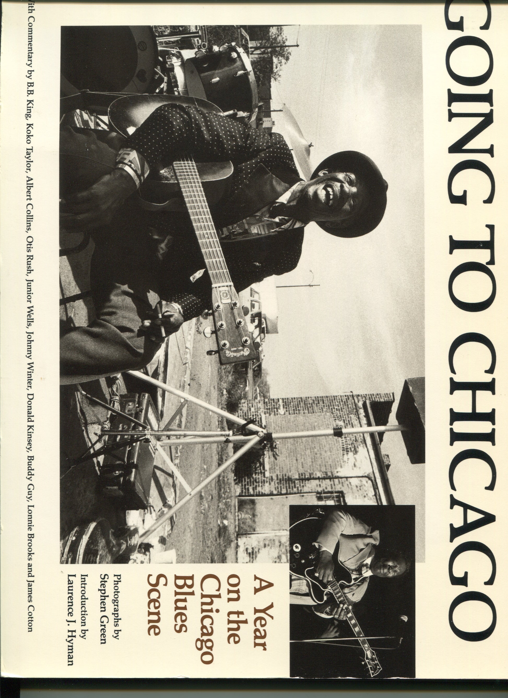 Woodford, 1990. Photographs by Stephen Green. Introduction by Laurence J. Hyman. Commentary by B.B. King, James Cotton, Koko Taylor, Otis Rush; Junior Wells, Johnny Winter, Donald Kinsey, Buddy Guy, and Lonnie Brooks. [Photographs taken in blues clubs of musicians performing, including Little Anthony; Ronnie Brooks Baker; Bobby Blue Bland; Sugar Blue; Lonnie Brooks; Charles Brown; Clarence Gatemouth Smith; Roy Buchanan; Jimmy Burns; Little Charlie and the Nightcats; Albert Collins; Joanna Connor; James Cotton; Robert Cray; Willie Dixon; Lil’ Ed and the Blues Imperials; David Honeyboy Edwards; Buddy Guy; John Lee Hooker; Etta James; Homewick James; Jimmy Johnson; Detroit Junior; Albert King; B.B. King; Big Daddy Kinsey; Taj Mahal; John Mayall; B.B. Odom; Pinetop Perkins; John Primer; Snooky Pryor; A.C. Reed; Jimmy Reed; Otis Rush; Big Time Sarah; Son Seals; Eddie Shaw; Magic Slim; Sunnyland Slim; Hubert Sumlin; Koko Taylor; Melvin Taylor; Big Twist and the Mellow Fellows; Valerie Wellington; Junior Wells; Kim Wilson; Johnny Winter; Mighty Joe Young, et al.]. Stiff illustrated wraps, not issued in hardcover. Very good and fresh book on the history of the blues in the Windy City.