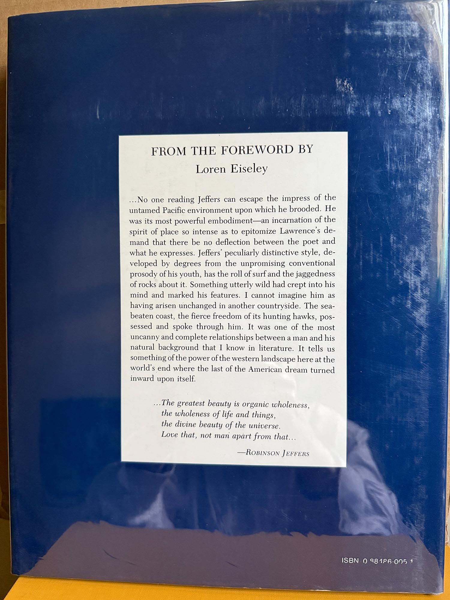 Arrowood Press, 1986, by arrangement with the Sierra Club, which published an earlier edition in 1965. Hardcover, 14 x 10.5 inches, fine with near fine protected dust jacket, like new. Edited by David Brower with text by Robinson Jeffers. 160 pages with color and black-and-white photographs of very scenic Big Sur on the Pacific Coast of California by prominent photographers. Photographers include Ansel Adams, Morley Baer, Wynn Bullock, Steve Crouch, William Garnett, Philip Hyde; Eliot Porter, Cole Weston, Edward Weston, Don Worth, and Cedric Wright. Includes some of the few color photographs made by Edward Weston. Excellently printed in Italy.